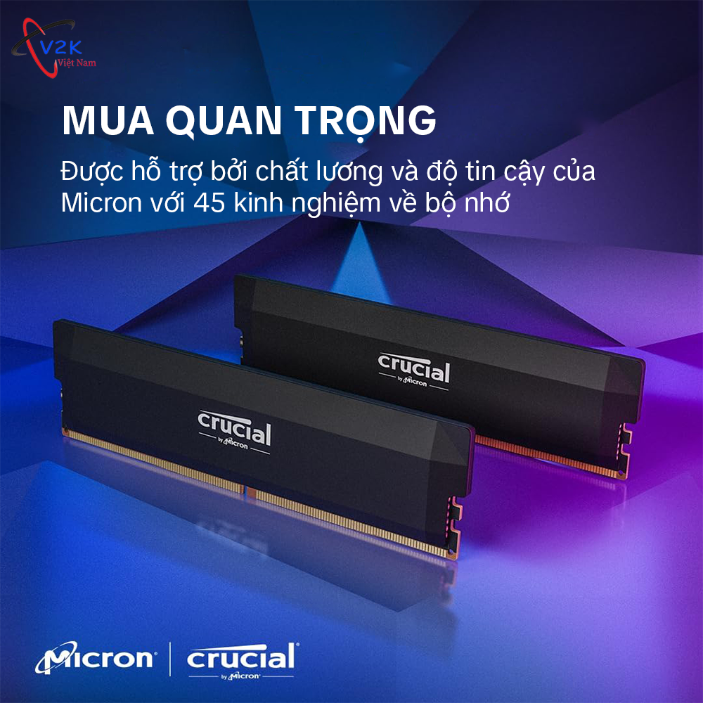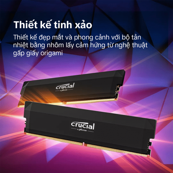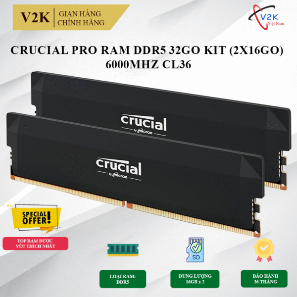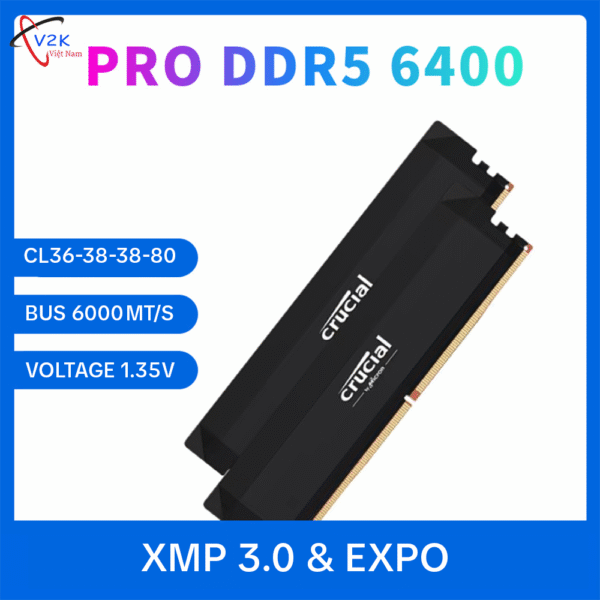 Bộ kit RAM Crucial Pro DDR5-6000 C36 gồm 2 thanh 16 GB, bus 6000 MT/s, độ trễ CL36, voltage 1.35 V. Hỗ trợ XMP 3.0 & AMD EXPO trên cùng mô đun, tản nhiệt nhôm phong cách origami, phù hợp build gaming, dựng hình, đa nhiệm nặng.
